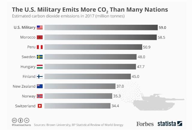 La construcción y el mantenimiento de enormes bases como las de las Marianas son una de las principales razones, junto con la producción de armas, el entrenamiento bélico y las propias guerras, por las que el ejército estadounidense es un gran contribuyente al calentamiento global. Aunque el Pentágono se ha presentado en ocasiones como respetuoso con el medio ambiente, los esfuerzos por «ecologizar» el ejército han sido superficiales en comparación con la escala de las operaciones estadounidenses. Las emisiones de gases de efecto invernadero del ejército superan a las de casi 140 países.