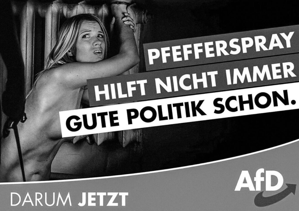Una parte significativa del éxito de la AfD tiene que ver con sus posturas de «valores familiares» en, incluso cuando también, sólo en aparente contradicción, se deleita provocativamente en una deliberada sensualidad. Como se ha señalado, aquí hay enormes ecos con la mezcla muy similar de racismo e incitaciones excitantes del nazismo. La contradicción deliberada, además, es en sí misma muy funcional, ya que amplía el público potencial, mantiene a los oponentes adivinando, entretiene con un humor astuto y proporciona una negación fácil en caso de reprimenda crítica. Dependiendo del contexto, por ejemplo, el partido se presenta como antigay y progay. Por un lado, los políticos de la AfD han abrazado un «mes del orgullo» nacionalista(Stolzmonat)-repleto del eslogan «contra la mierda del arco iris y la locura de género»- en abierto antagonismo con la defensa del orgullo LGBT. Por otro lado, se apela a los votantes homosexuales a través de un racismo contundente con eslóganes como «Mi pareja y yo no valoramos conocer a inmigrantes musulmanes, para quienes nuestro amor es un pecado mortal».[2]