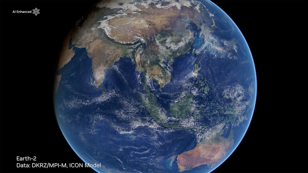 Nuestro mundo se ha sumido en una paradoja borgiana: el mapa y el territorio se han convertido en uno a escala 1:1.[57] Hoy en día, lo importante no es solo quién controla el territorio, sino también quién controla el modelo. La «gran máquina» de la modelización medioambiental ha aumentado exponencialmente su resolución y su capacidad predictiva. Aparte de las preocupaciones válidas sobre el sesgo de los datos en los que se basan estos sistemas, en este nuevo cambio de paradigma, nuestra posición confunde el espacio de simulación y el cielo que nos cubre, escribiendo el guion del tiempo y esculpiendo las nubes para reescribir los términos de la naturaleza. Entra en escena NVIDIA, un arquitecto clave de la infraestructura contemporánea de IA y actor principal en la visualización y modelización planetaria, que comenzó como una empresa especializada en chips gráficos para videojuegos. Junto con su producción principal de chips de IA para infraestructura de defensa y armas, una de las iniciativas insignia de NVIDIA es la plataforma de modelización meteorológica hiperlocal de IA más «benigna» que denomina «Earth-2». En esta simulación de alta fidelidad del sistema atmosférico del planeta, denominada «Twin Earth» (impulsada por las nubes gracias a los chips GPU de la propia empresa), NVIDIA sueña con pronosticar fenómenos meteorológicos extremos. El primer cliente en inscribirse: Taiwán.[58]