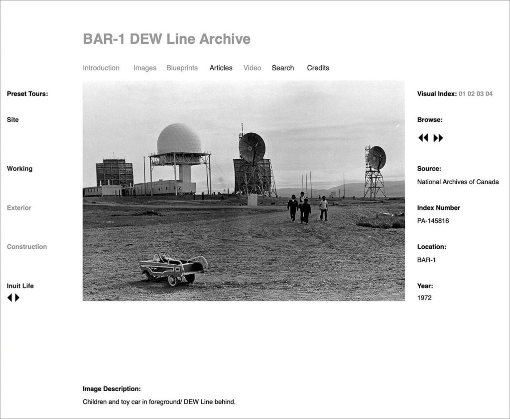 - Para consultar un archivo en línea que documenta la exploración, la construcción y el funcionamiento diario de una estación de la línea DEW, así como la interfaz de la estación con las comunidades inuit locales, véase el BAR-1 DEW Line Archive del historiador de Parks Canada David Neufeuld, codificado y alojado por mí mismo a partir de mi DEW Project de 2009 →.