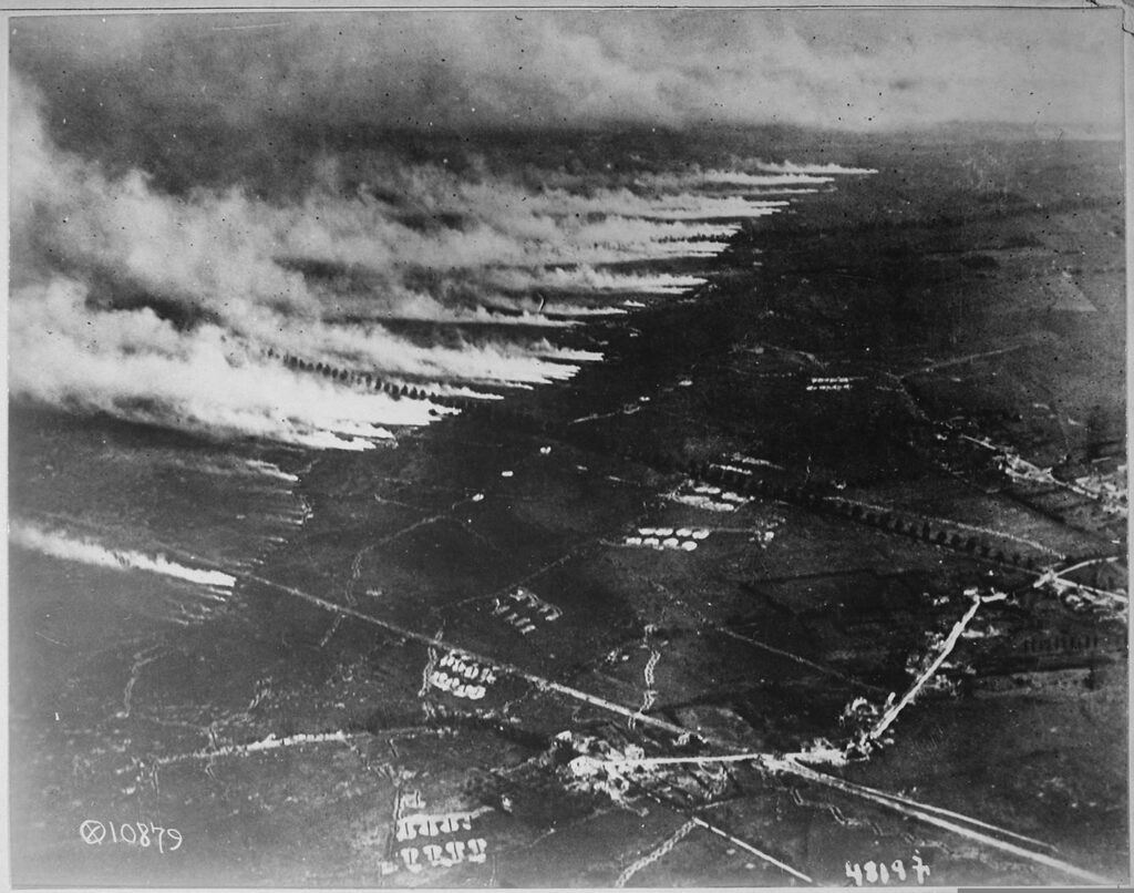 Soldados franceses lanzando gas y llamas contra trincheras alemanas en Flandes, Bélgica, 1917. Cortesía de la Administración Nacional de Archivos y Registros de EE. UU.