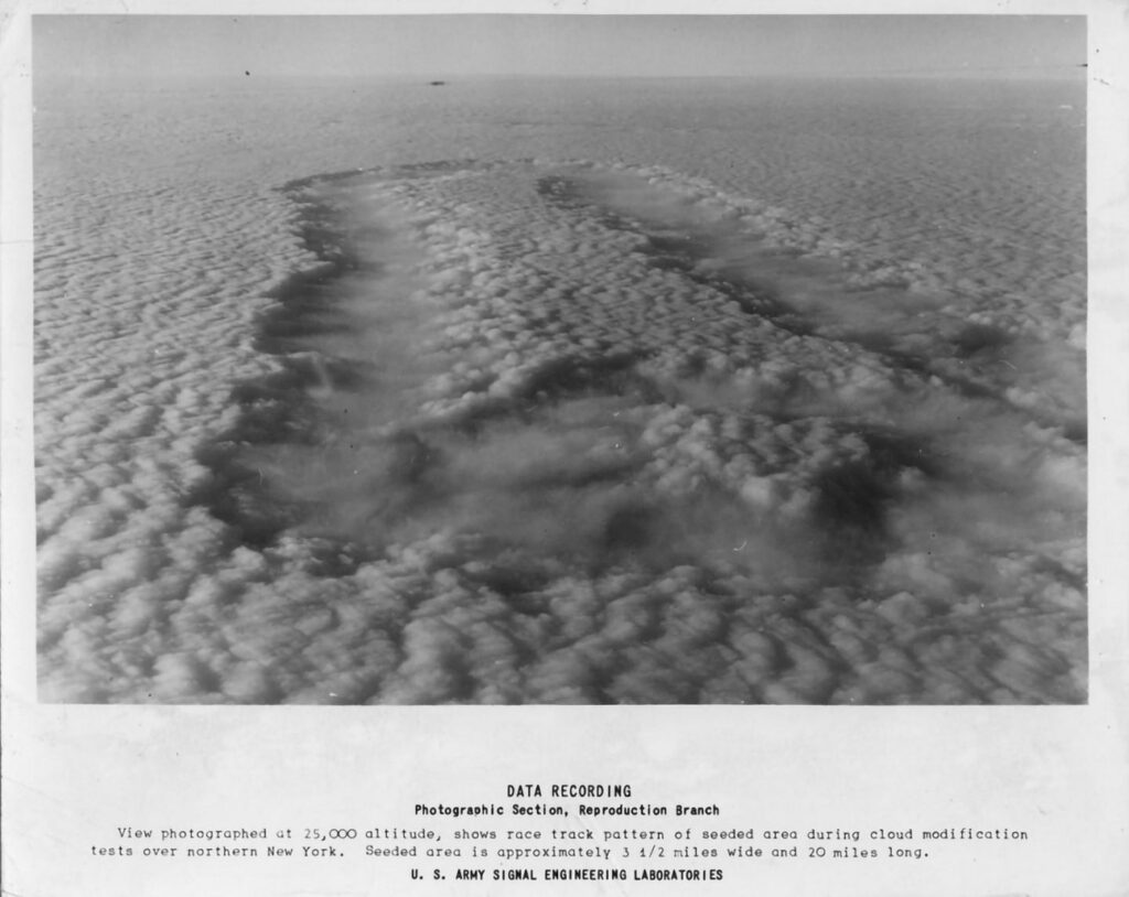 En 1953, el presidente Eisenhower nombró a Howard T. Orville presidente del Comité Asesor Presidencial sobre Control Meteorológico.[44] Aunque en su discurso ante el Congreso en 1958 Orville especuló sobre una escalofriante lista de planes de modificación del tiempo y el clima, su carrera se centró principalmente en la siembra de nubes, un método para inducir la lluvia en lugares específicos que James P. Espy había teorizado ya en 1838. Espy nunca consiguió apoyo para poner en práctica sus teorías sobre grandes incendios inspiradas en antiguas prácticas de «quemas controladas» que, según los rumores, utilizaban los indígenas de Paraguay y los antiguos babilonios.[45] A diferencia de Espy, que trabajaba para la Marina, fue el pacifista francés Charles Le Maout quien más tarde intentó relacionar la lluvia con la violencia basándose en pruebas anecdóticas del mal tiempo que seguía a las batallas, una idea que compartía el general retirado de la Guerra Civil Edward Powers en su libro de 1871 War and the Weather, or, The Artificial Production of Rain (La guerra y el tiempo, o la producción artificial de lluvia). La teoría del siglo XIX pasó rápidamente a convertirse en una práctica dudosa en manos de los empresarios David Ruggles y Robert St. George Dyrenforth, quienes afirmaban que disparar explosivos de artillería a la atmósfera podía provocar la lluvia deseada. Para estos «paradoxistas», la solución a las crisis medioambientales era, literalmente, bombardearlas.[46] Pervirtiendo aún más la lógica, ¿por qué no utilizar el clima como arma?