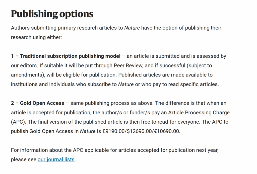 La mayoría de las revistas cobran entre dos y seis mil euros por el acceso abierto, y las publicaciones de élite como Nature superan los diez mil euros. Es habitual que la mitad del presupuesto de un proyecto de investigación se destine a pagar las tarifas de publicación.