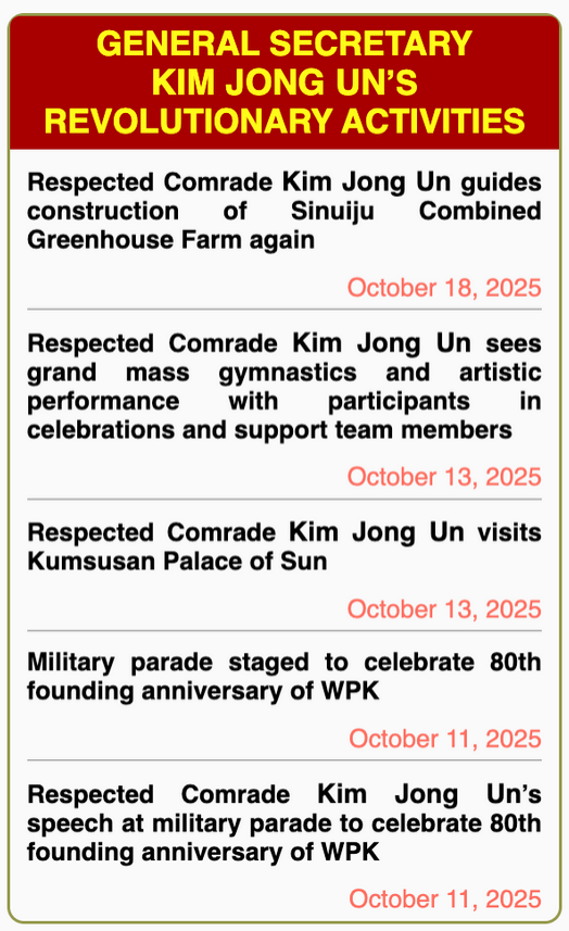Lo primero que se nota en la página web del Pyongyang Times es que un alto porcentaje de los titulares empiezan con las palabras «Respetado camarada Kim Jong Un», seguidas de algo completamente banal. En el momento de escribir estas líneas, la noticia principal del periódico era «El respetado camarada Kim Jong Un dirige de nuevo la construcción de la Granja Invernadero Combinada de Sinuiju» -el «de nuevo» es una pequeña guinda encantadora, que sugiere que no quedó del todo satisfecho la primera vez. Unos días antes, fue «El respetado camarada Kim Jong Un asiste a un gran espectáculo masivo de gimnasia y arte con los participantes en las celebraciones y los miembros del equipo de apoyo.» Antes, «El respetado camarada Kim Jong Un visita el Palacio del Sol de Kumsusan». Todas estas historias, si es que se les puede llamar historias, están recopiladas en una sección lateral titulada “ACTIVIDADES REVOLUCIONARIAS DEL SECRETARIO GENERAL KIM JONG UN”, que parece cumplir la misma función que una columna deportiva semanal o una tira cómica de Garfield en un periódico estadounidense.