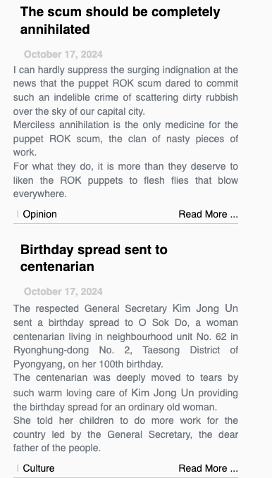 La excepción a este tono idílico se produce cuando el periódico realiza encendidas denuncias contra EE.UU., Corea del Sur, Japón y el resto de los enemigos oficiales de la RPDC (que, en estos días, incluyen a Ucrania). Estos artículos no son frecuentes, pero cuando aparecen, resultan chocantes. Uno de los ejemplos más extremos se titula «La escoria debe ser completamente aniquilada», del 17 de octubre de 2024: