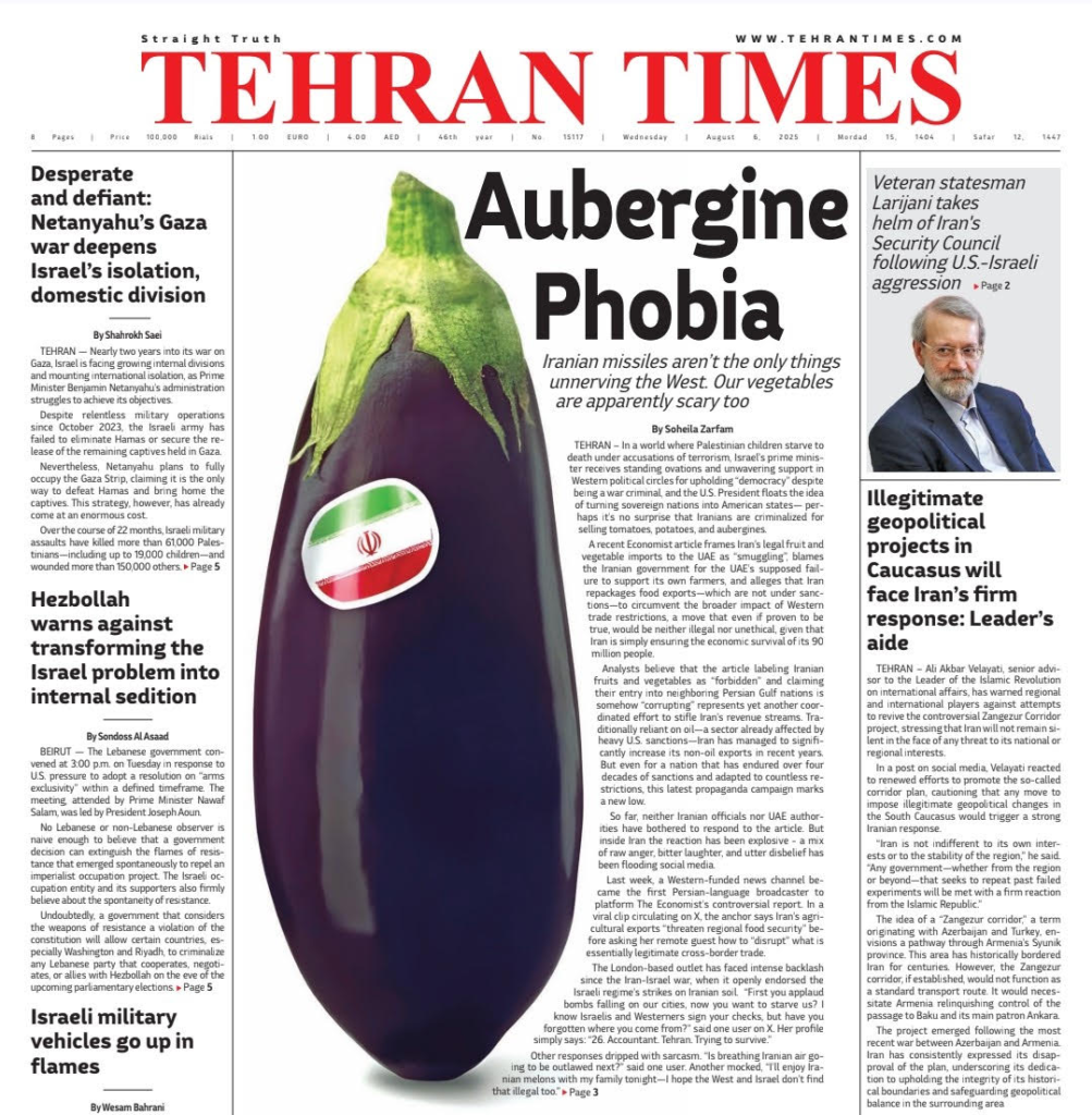 «Irán suministra ahora nueve de cada diez coliflores, tomates y sandías que importan los EAU», se inquieta el autor, y amenaza así con convertirse en un «hegemón de las verduras y las sandías». Esto es malo, según The Economist, porque permite a Irán «esquivar» las sanciones estadounidenses. En el artículo no se cuestiona el derecho de Estados Unidos a sancionar a los países que quiera, ni los efectos devastadores de dichas sanciones sobre los civiles iraníes que no tienen nada que ver con las decisiones del ayatolá. Sólo hay mucho alarmismo sobre «la invasión verde de Irán», incluyendo «verduras sin raíz y kiwis infiltrados». Así respondió el Tehran Times en su edición del 5 de agosto, burlándose del pánico a los productos de The Economist :