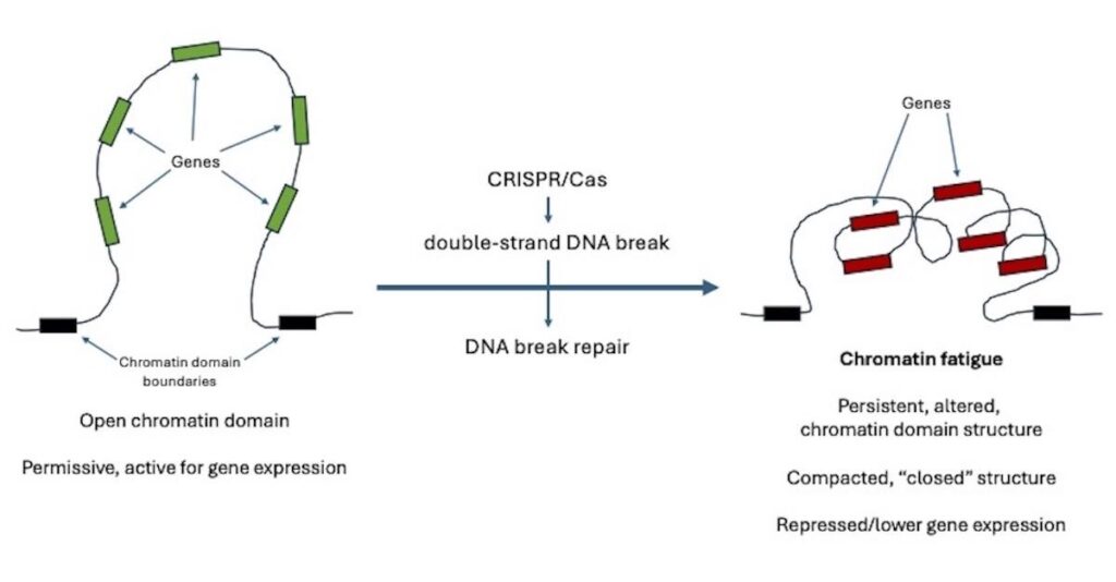 El nuevo estudio añade otro mecanismo más, la fatiga de la cromatina, por el cual los procesos de edición genética pueden causar importantes alteraciones en la función de los genes: la rotura del ADN de doble cadena inducida por la edición genética CRISPR y su posterior reparación pueden afectar gravemente a la expresión de muchos genes.