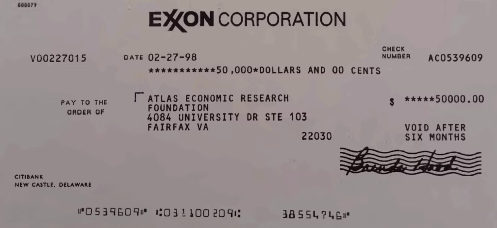 En marzo de 1998, Exxon envió un cheque de 50.000 dólares a Atlas Network.