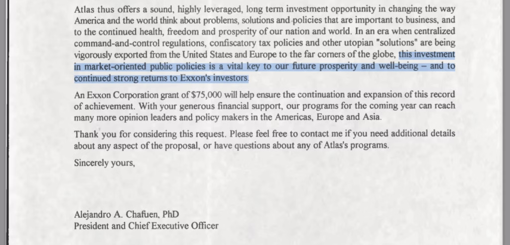 Ese donante era Exxon, que -como se detalla en una carta de 1997 del ejecutivo de Exxon William Hale a Atlas Network- estaba «interesado en fomentar los grupos de reflexión sobre el libre mercado fuera de Estados Unidos», en particular en Asia, la antigua Unión Soviética, Europa y América Latina. Exxon estaba dispuesta a dar a Atlas «hasta 50.000 dólares» -ajustados a la inflación, unos 100.000 dólares en dinero de hoy- para hacer crecer «grupos internacionales con capacidad de influir en las políticas gubernamentales.»