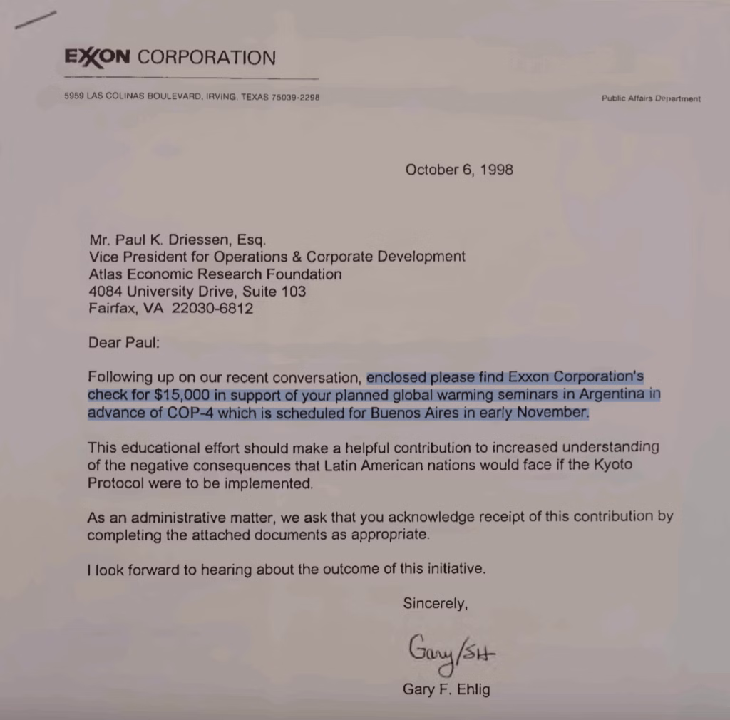 Exxon aprobó el plan y el 6 de octubre de 1998 envió por correo 15.000 dólares más a Atlas «en apoyo de sus seminarios sobre calentamiento global previstos en Argentina antes de la COP-4». La carta, cuyo autor era el ejecutivo de Exxon Gary Ehlig, predecía que los seminarios podrían conducir a «una mayor comprensión de las consecuencias negativas a las que se enfrentarían las naciones latinoamericanas si alguna vez se aplicara el Protocolo de Kioto».
