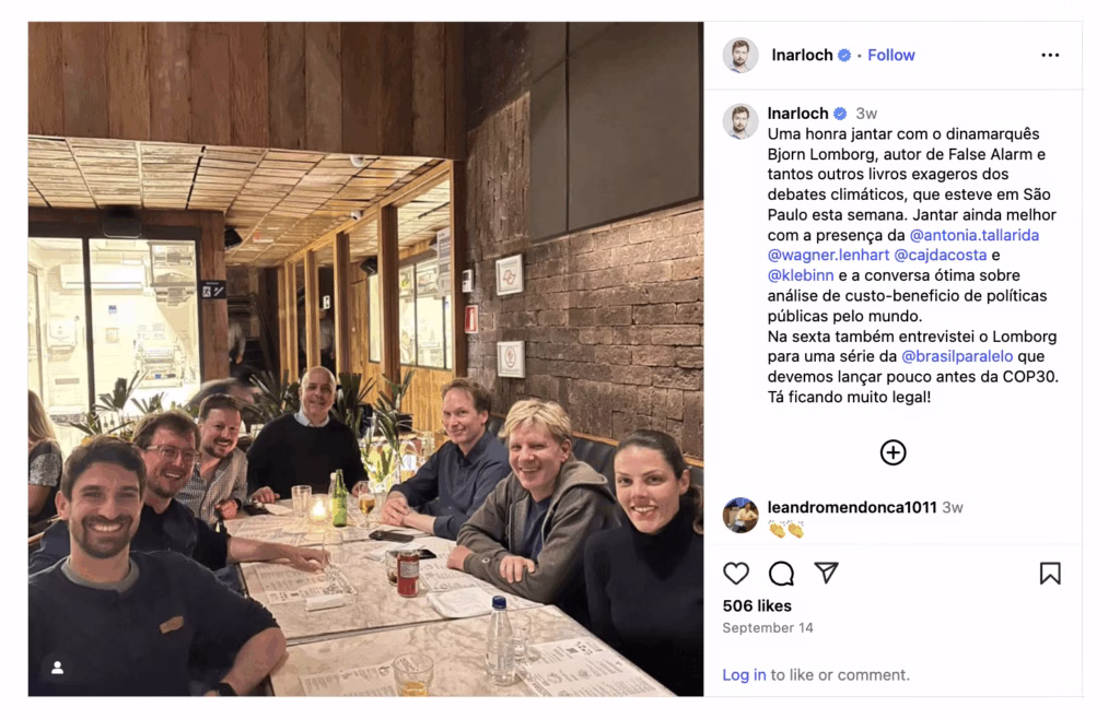 Lomborg no respondió a preguntas detalladas sobre sus actividades en Brasil. El anfitrión del acto universitario fue el profesor del IBMEC Adriano Gianturco, que es miembro de la junta directiva del Instituto Liberal, un think tank con sede en Río de Janeiro y socio de la Red Atlas con un historial de difusión de desinformación climática por toda América Latina.