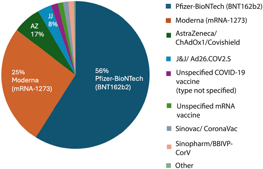 Distribución de las formulaciones de las vacunas entre los pacientes vacunados con cáncer notificado tras la inmunización contra la COVID-19. La mayoría de los casos se relacionaron con las vacunas de Pfizer-BioNTech (BNT162b2; 56 %) y Moderna (mRNA-1273; 25 %), seguidas de AstraZeneca/ChAdOx1 (Covishield; 17 %) y Johnson & Johnson/Ad26.COV2.S (8 %). Una pequeña parte de los informes se refería a Sinovac (CoronaVac), Sinopharm (BBIBP-CorV) u otras vacunas inactivadas, así como a tipos de vacunas de ARNm o COVID-19 no especificados. El predominio de las vacunas de ARNm refleja su uso generalizado a nivel mundial durante el período de estudio.