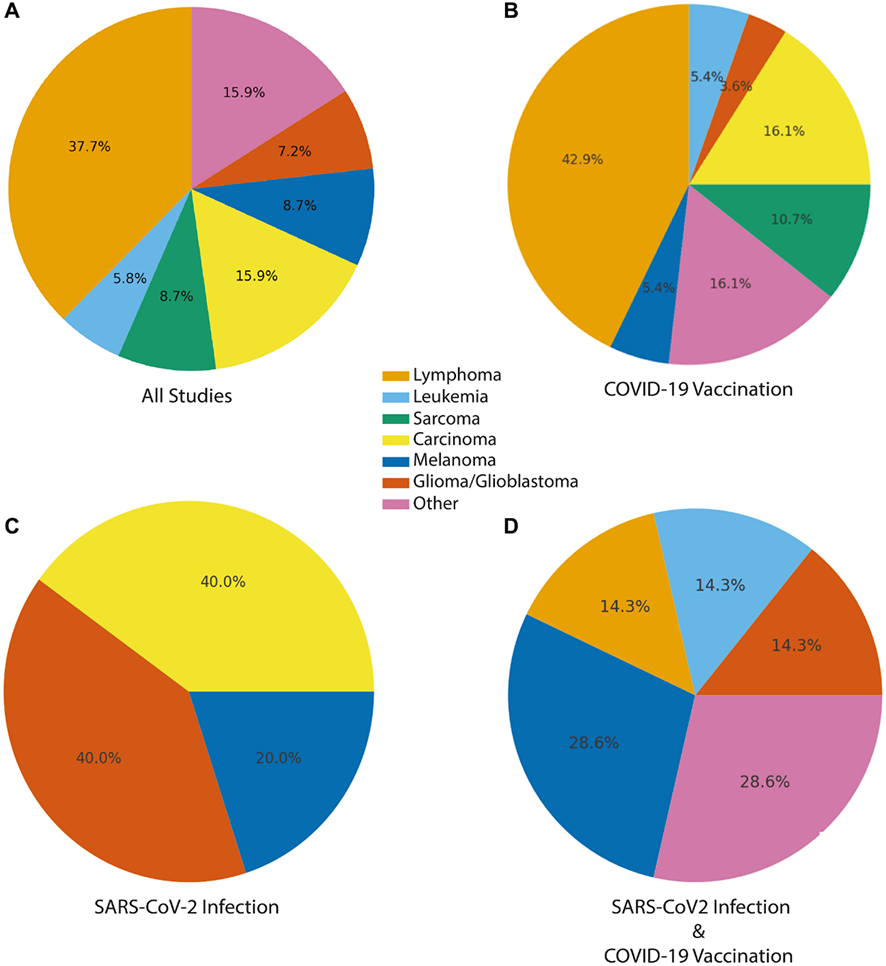 Distribución de los informes con casos de cáncer o lesiones tumorales asociados temporalmente con la vacunación contra la COVID-19, la infección por SARS-CoV-2 o la infección por SARS-CoV-2 y la vacunación. Los gráficos circulares muestran la representación proporcional de las principales categorías de cáncer observadas. (A) En todos los estudios. (B) Vacunación contra la COVID-19, (C) infección por SARS-CoV-2 y (D) infección por SARS-CoV-2 y vacunación contra la COVID-19 combinadas. Los tipos de cáncer se consolidaron en siete categorías de alto nivel. El carcinoma incluye: cáncer de mama, cáncer de próstata, cáncer de colon, cáncer de páncreas, cáncer de pulmón, carcinoma de células de Merkel, neoplasia gastrointestinal/poliposis. El linfoma también incluye neoplasias linfoides, trastornos linfoproliferativos cutáneos y trastornos linfoproliferativos. Otros incluyen tumores benignos, pseudotumores, tumores mixtos, tumores cardíacos, tumores inflamatorios y no específicos (por ejemplo, miofibroblásticos).